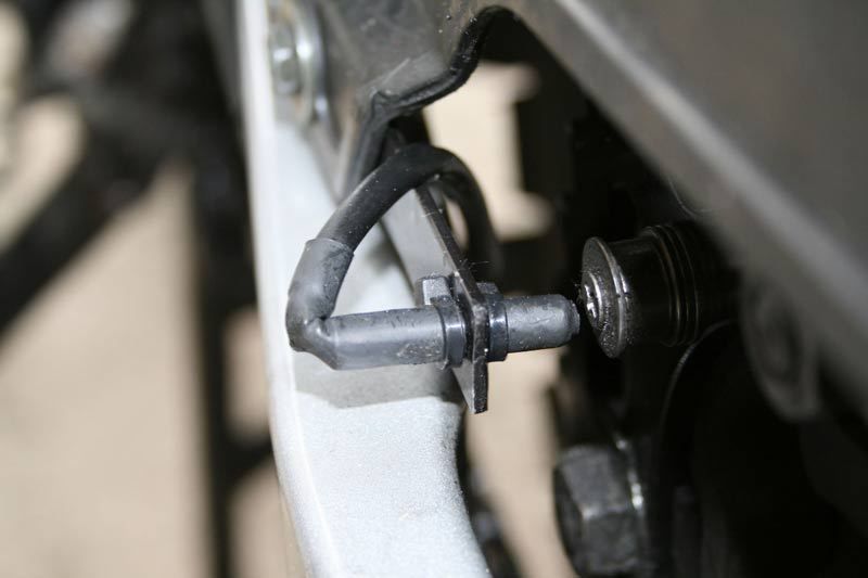 Hier sieht man - oder auch nicht - die einzelnen Komponenten an der Hinterradschwinge. Die Kabel für den Reddkontakt und die Öl-Förderleitung sind an der Unterseite der Schwinge geführt.